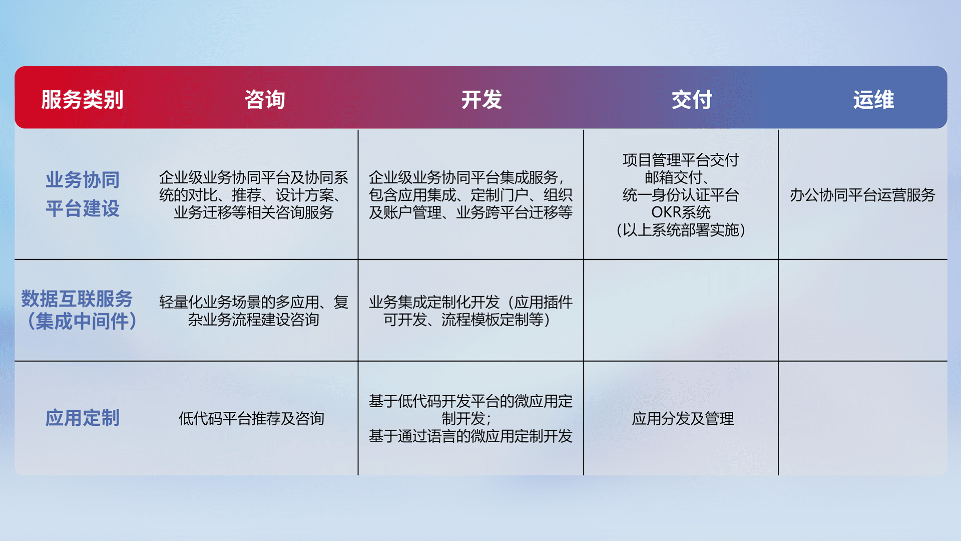 针对钉钉、、企微、、IDaas等平台级产品提供产品的规划、、方案、、、交付、、定制化开发等服务,,实现如统一协同办公、、、智能客户服务、、混合会议管理、、、、智能数据查询、、、、等业务场景,,,实现数字化转型。。。